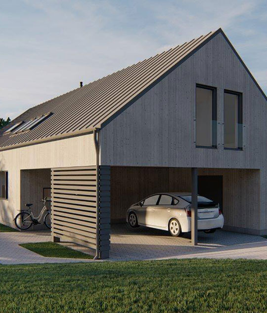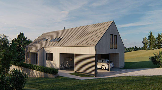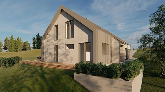 Der Hausentwurf „Lärche“ ist ein Paradebeispiel modernen Wohnens, das zeitgemäßes Design und hochwertige Materialien auf 185 qm Gesamtfläche harmonisch vereint. Von außen beeindruckt das Haus mit seiner eleganten Fassade, die eine warme und einladende Atmosphäre schafft. Große Fensterfronten sorgen für reichlich Tageslicht und bieten einen wunderschönen Ausblick in die Umgebung.
