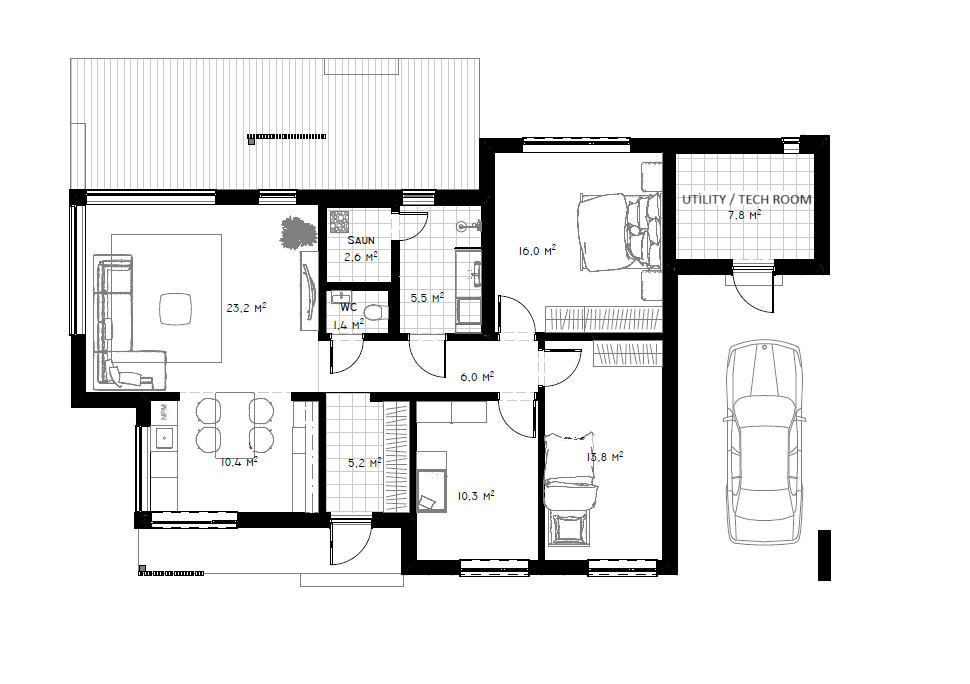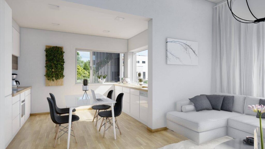 Mit einer Gesamtfläche von 154 qm und einer Nutzfläche von 105 qm bietet das Haus viel Platz zum Wohlfühlen. Innen überzeugt das Haus mit einem offenen Grundriss, der den Wohn-, Ess- und Küchenbereich nahtlos miteinander verbindet. Die drei Schlafzimmer sind großzügig gestaltet und bieten ausreichend Platz für Erholung. Zudem verfügt das Haus über eine Sauna und einen praktischen Autounterstand. Hochwertige Materialien und eine sorgfältige Verarbeitung sorgen für ein behagliches Wohngefühl. Der Außenbereich mit Terrasse lädt zum Entspannen und Genießen ein, was das „Lebensbaum“ zu einem idealen Rückzugsort macht.