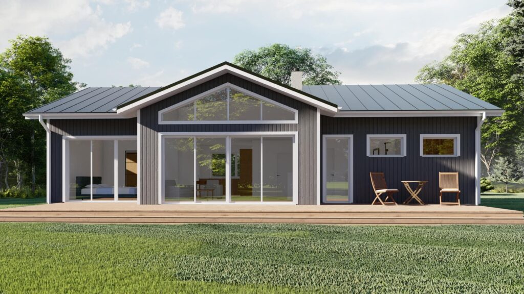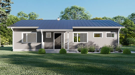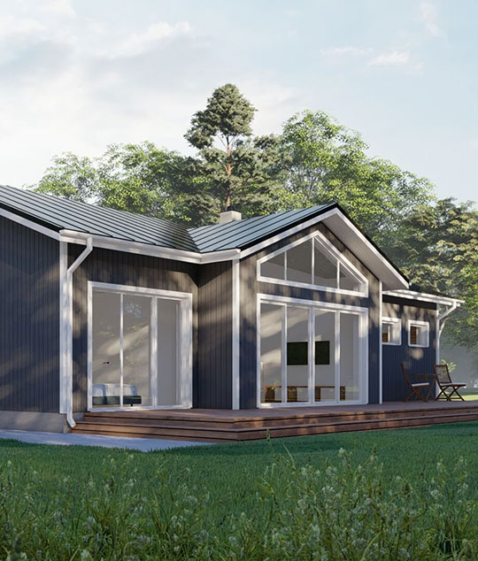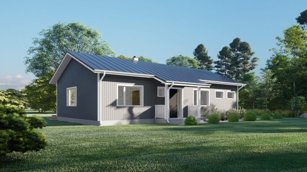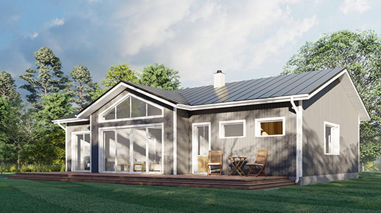 Das Elementhaus Tanne 110 bietet eine Gesamtfläche von 137 qm, eine Nutzfläche von 110 qm, Terrasse, Sauna, 3 Schlafzimmer, 2 WC und Lagerraum.