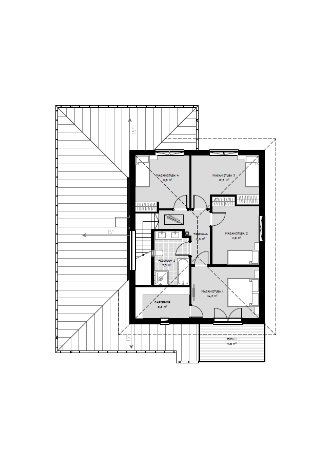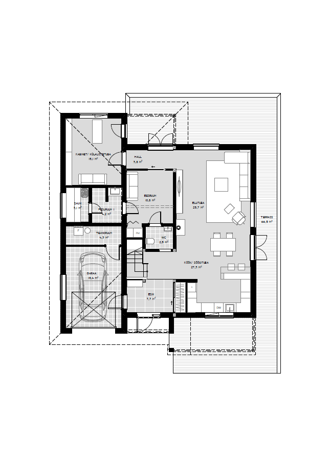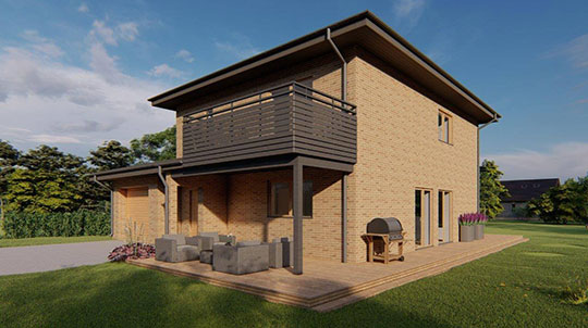 Das Elementhaus Wacholder 194 bietet eine geräumige Gesamtfläche von 224 qm und Nutzfläche von 194 qm. 3 Schlafzimmer, 2 WC, Gästezimmer, Sauna, Garage, Terrasse von 66 qm und einen Balkon mit 9.6 qm